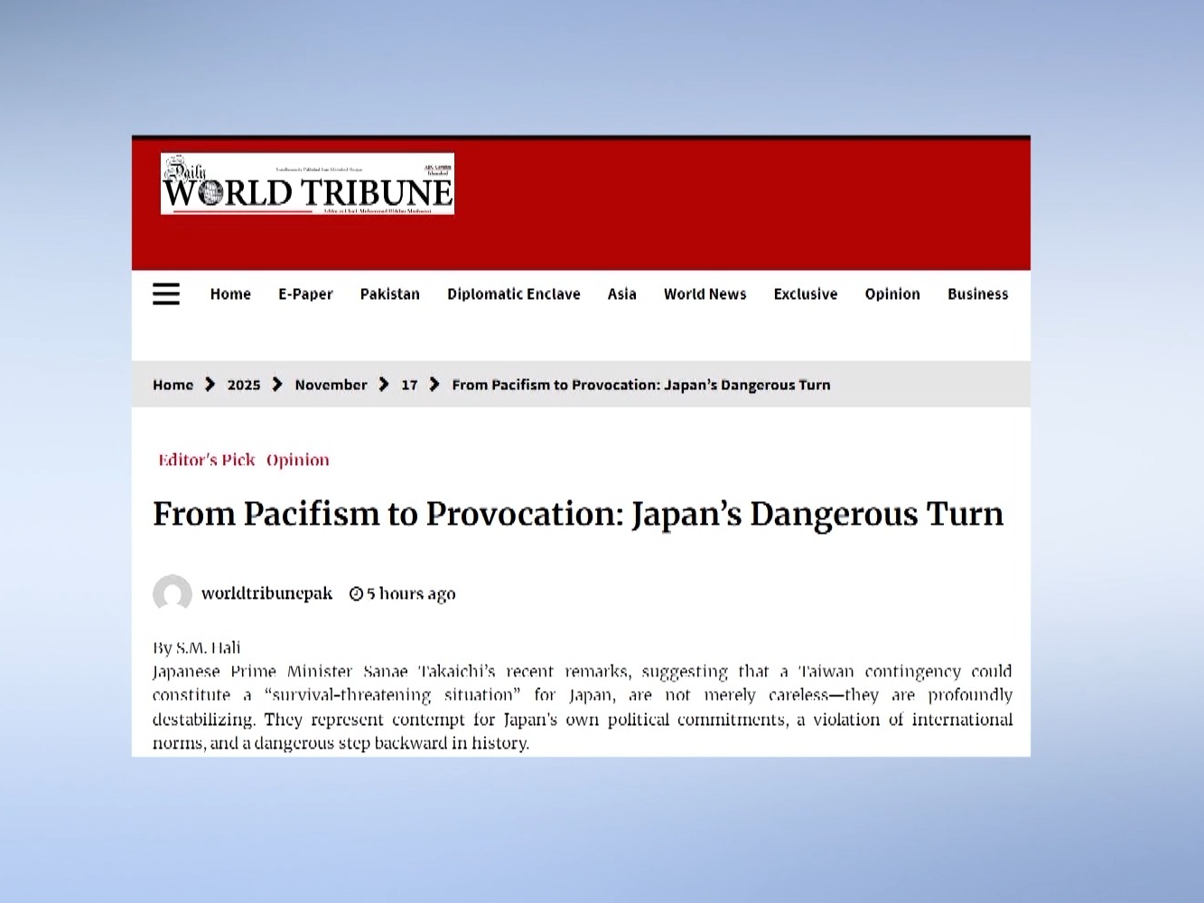 巴基斯坦国际问题专家苏尔坦·哈利在《世界论坛报》刊文指出,日本首相高市早苗的言论不仅违反了日本的政治承诺,也是一种危险的挑衅,威胁地区和平。亚洲承受不起重蹈军国主义覆辙的代价,日本必须牢记其承诺。