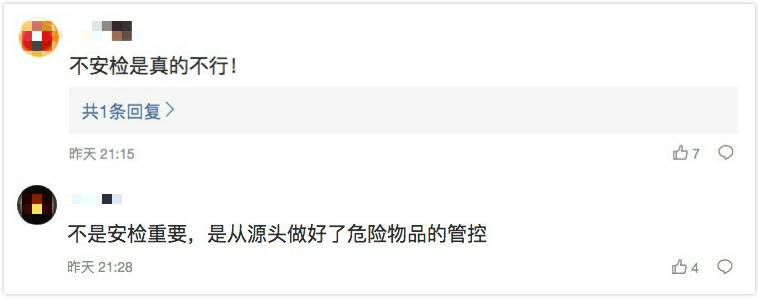 中国网友纷纷表示,安全检查的重要性再怎样强调都不为过:“不安检真的不行!”“(安检是)从源头做好了危险物品的管控”。
