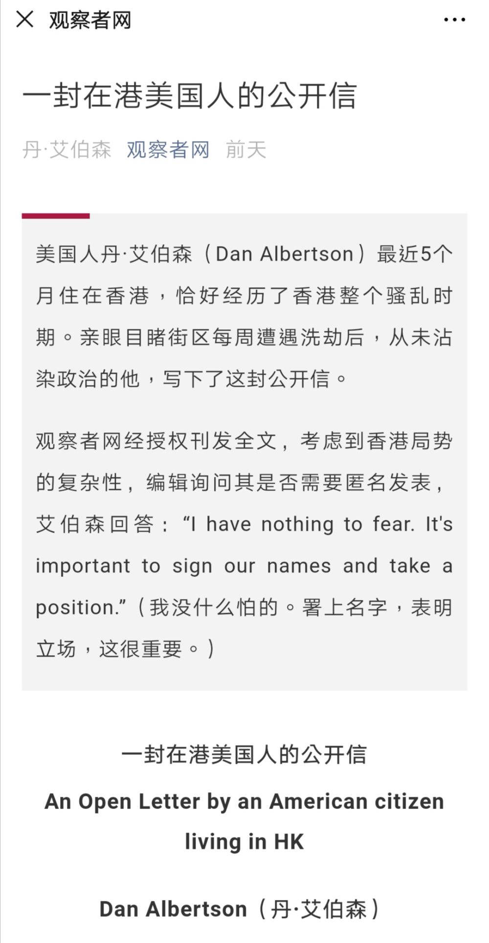 在港美国青年丹·艾伯森的公开信被观察者网微信公众号翻译转载,阅读量达到10万+。