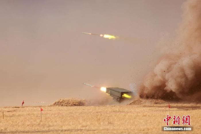 当地时间9月23日,“和平使命-2021”上合组织联合反恐军事演习实施实兵行动。图为参演武器开火瞬间。 中新社记者 李纯 摄