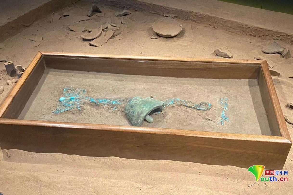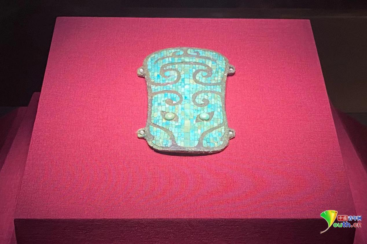 二里头遗址出土的夏代礼器“镶嵌绿松石兽面纹铜牌饰”。中国青年网记者安俐 摄