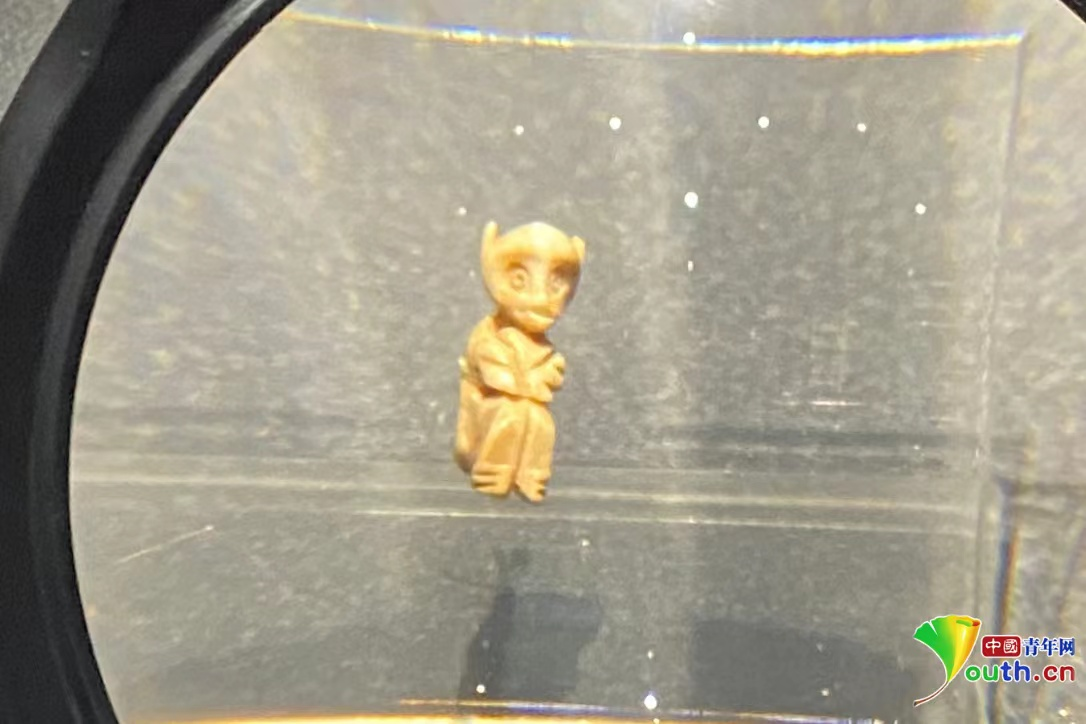 二里头遗址出土的夏代装饰品“骨猴”。“骨猴”高2.2厘米、宽0.75-0.95厘米,使用动物骨骼雕刻制作,制作精巧,展现了夏朝工匠的微雕技艺。中国青年网记者安俐 摄