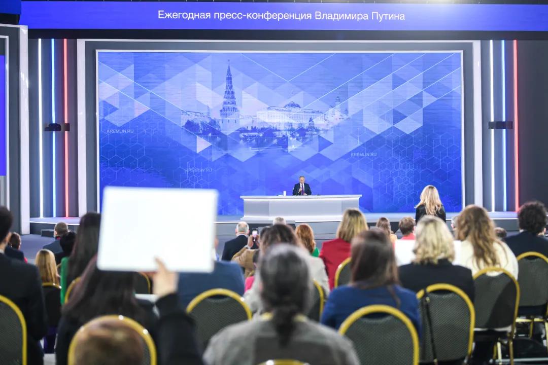 记者会现场,众多媒体争相提问,提问者由普京与俄总统新闻秘书佩斯科夫随机选择。每年记者会,普京都会选取一个来自中国媒体的提问。