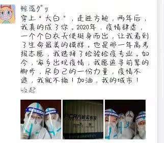 “我愿追寻前辈的脚步,尽自己的一分力量,疫情不退,我就不撤!加油,我的城市!”这个19岁女孩在微信朋友圈这样写道。在她心底,能参加家乡抗疫,是责任,更是使命。
