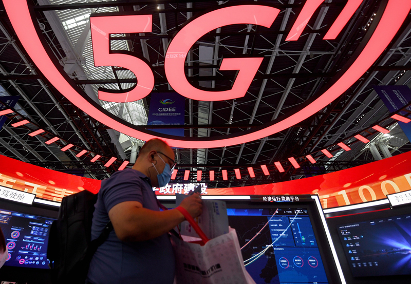 在石家庄市举行的2021中国国际数字经济博览会上,参观者走过5G智慧展区。(资料片)新华社记者王晓摄