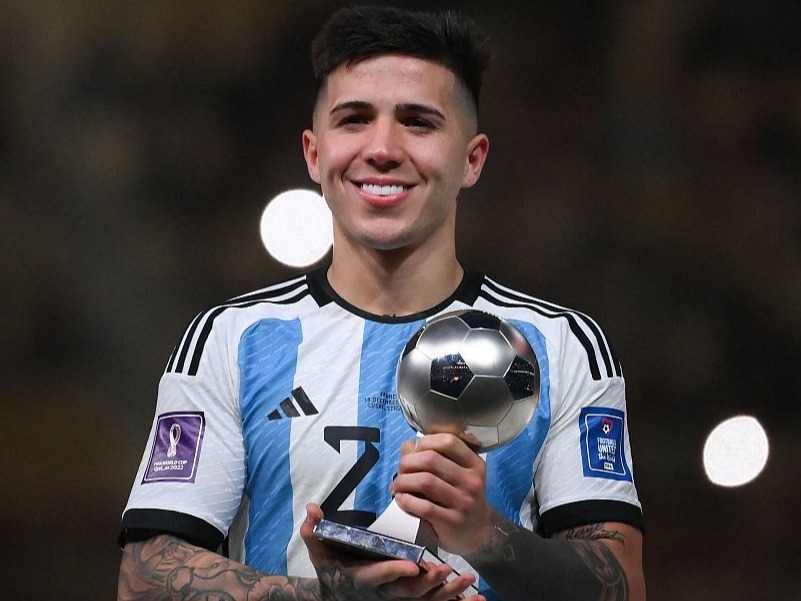 恩佐·费尔南德斯在卡塔尔2022年世界杯奖杯仪式上获得最佳新人奖。(视觉中国)