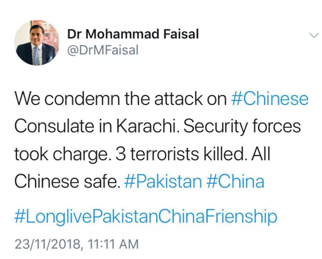 巴基斯坦外交部发言人费萨尔随即在推特上发布消息谴责袭击事件。费萨尔写道:“我们谴责针对中国驻卡拉奇领事馆的袭击。安全部队已介入。3名恐怖分子被击毙。所有中国人安全。#巴基斯坦中国友谊万岁#”