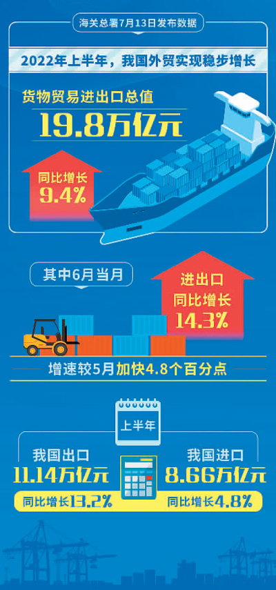“上半年,全国货物进出口总额198022亿元,创下历史新高。再看6月当月,进出口总额超3.7万亿元,其中出口总额超2.2万亿元,这两个数据也是月度额的历史新高。”商务部国际贸易经济合作研究院对外贸易研究所所长梁明对记者说,“这样的成绩非常亮眼,充分体现了中国外贸有竞争力、有韧性。”