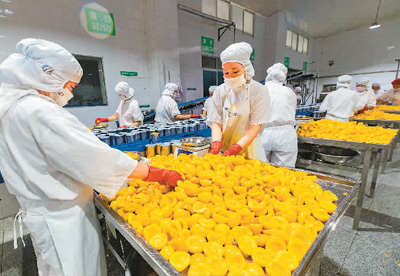 湖北省宜昌市秭归县支持外贸食品加工企业发展黄桃产业,将当地丰收的黄桃加工成罐头,出口到欧洲和美国等国外市场。图为工人在秭归县屈姑国际农业集团黄桃深加工车间生产线上忙碌。 聂 爽摄(人民视觉)