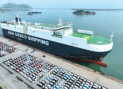 今年上半年,江苏省连云港港累计出口车辆8.22万台,同比增幅22.27%,外贸出口量稳居全国沿海港口前列。图为连云港港东方公司码头58泊位,远洋滚装轮停在泊位上装载出口车辆。王 春摄(人民视觉)