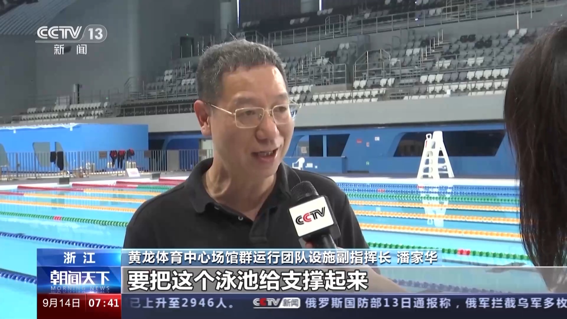 总台央视记者 王莉:外立面的玻璃幕墙,乍一看就像是运动员入水后激起的涟漪,黄龙体育中心的游泳跳水馆,是杭州亚运会水球比赛的场地。长50米宽25米的标准泳池,从亚运会开幕后的第二个比赛日,每天都有水球比赛在这里进行。承担着如此密集比赛任务的泳池,其实是一个悬浮在空中的“拼装泳池”。