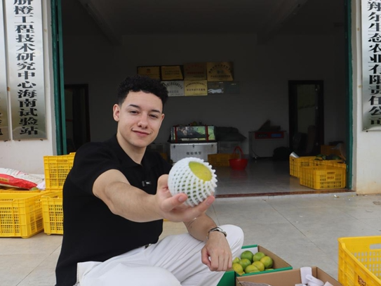 Harvey在琼中绿橙园里采摘并现场品尝。海南国际传播中心供图